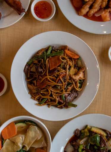 Sliced beef with fresh seasonal vegetables stir fried in oyster sauce and served on a bed of noodles.